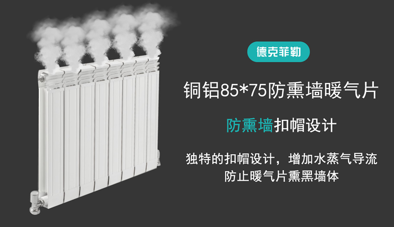 針對些問題,目前市場上推出了很多防熏墻的暖氣片,比如德克菲勒推出的85*75防熏墻款的銅鋁復(fù)合暖氣片,既能提高散熱器又能防止熏黑墻??梢哉f是最直接的解決辦法!